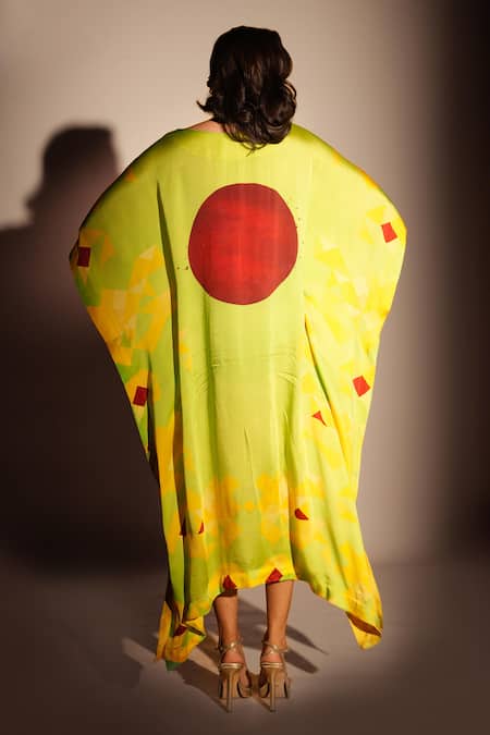 A light green kaftan crafted from satin georgette fabric, featuring a digital print with a large red circular motif on the front and back, complemented by yellow geometric patterns on the lower half.