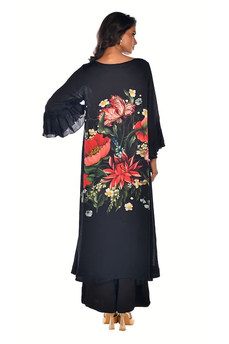 A black kurta in satin georgette featuring digital floral prints and bell sleeves. It is paired with coordinating palazzo pants.