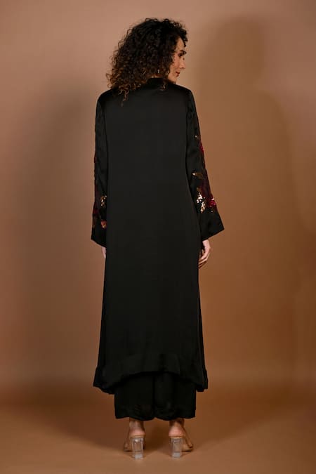 A black satin georgette kurta with an attached lining, hand-embroidered with sequins, beads, and zardosi work. It is paired with coordinating black satin georgette pants.