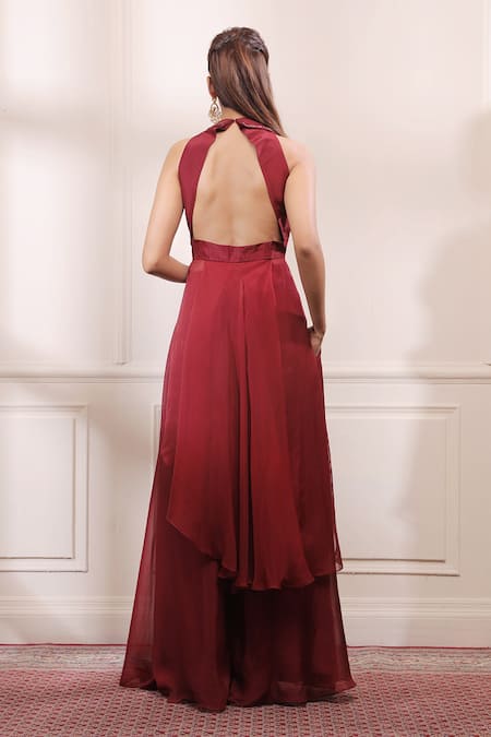 Ruby red kurta with double collared embroidered yoke in silk with asymmetric organza flare. Paired with organza sharara pant.