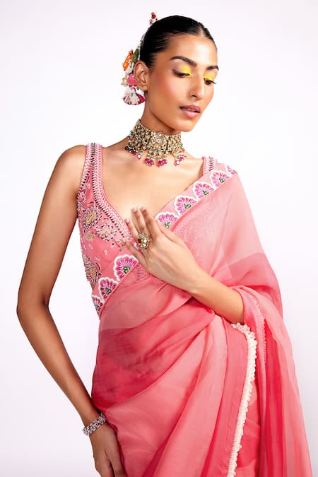 Pink color block saree featuring floral embroidery and pearl encrusted border. Paired with a floral embroidered blouse and includes a petticoat.