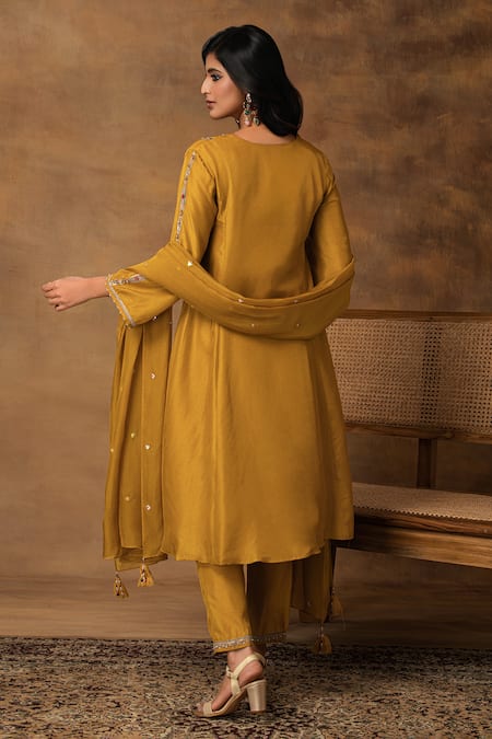 Golden yellow silk kurta featuring intricate embroidery and a V-neckline. Paired with matching pant and dupatta adorned with embellishments.