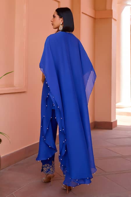Blue kurta featuring tilla, dori and brass beaded embroidery. Accompanied by a matching pant and a flared sleeves organza cape.