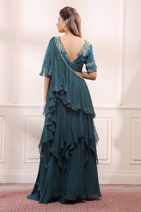 Jade green layered lehenga with asymmetric hem. Paired with embroidered blouse & pleated palla with embroidered borders.