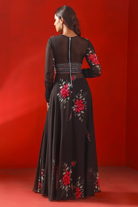 Black Georgette, Crepe Embroidery Round Neck Magnolia Print Anarkali Set
