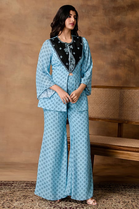 Powder blue peplum top featuring a black embroidered neckline and bell sleeves. Paired with matching wide-leg pants in a coordinating pattern.