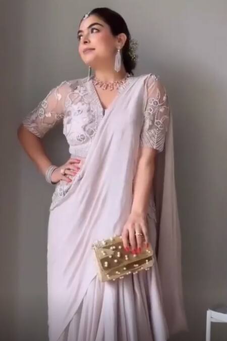 Ecru pre-stitched lehenga saree with double layered asymmetric flare. Paired with embroidered jacket style top.
