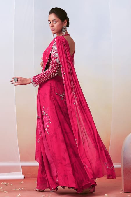 Pink pre-draped saree with attached lining, floral print & embroidered border. Paired with embroidered padded blouse.