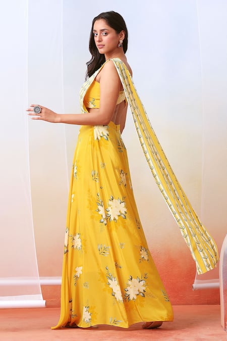 Yellow pre-draped saree with floral print. Paired with embroidered padded blouse.