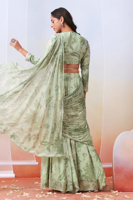 Sage green pre-draped saree with floral print. Paired with embroidered blouse & belt.