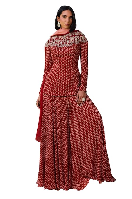 Red Georgette, Organza, Satin Sequins, Sara Bandhani Pattern Kurta Sharara Set
