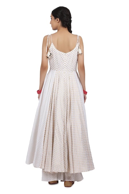 Ivory anarkali with all-over gold scallop print, sequin work on the bodice and tie up shoulder straps. Comes with sharara and dupatta.