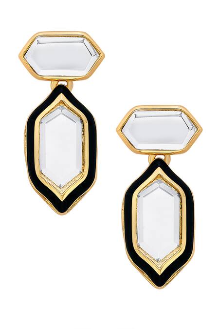 Black geometric shaped stud earrings featuring hand cut mirror embellishments
