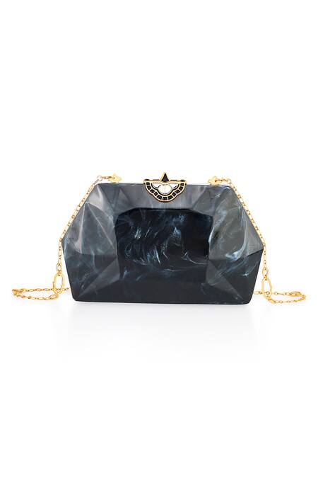 Black resin clutch featuring geometric cut work and enameled detailing