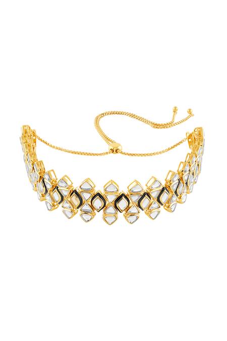 A gold 18kt gold plated brass choker necklace featuring a Mughal-inspired design with turquoise accents and an adjustable chain closure.
