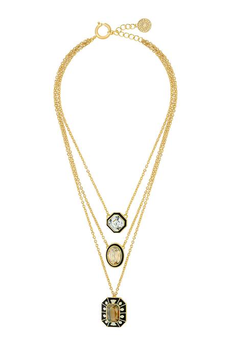 18K gold plated tri-layered necklace featuring crystal embellishments and enamel detailing