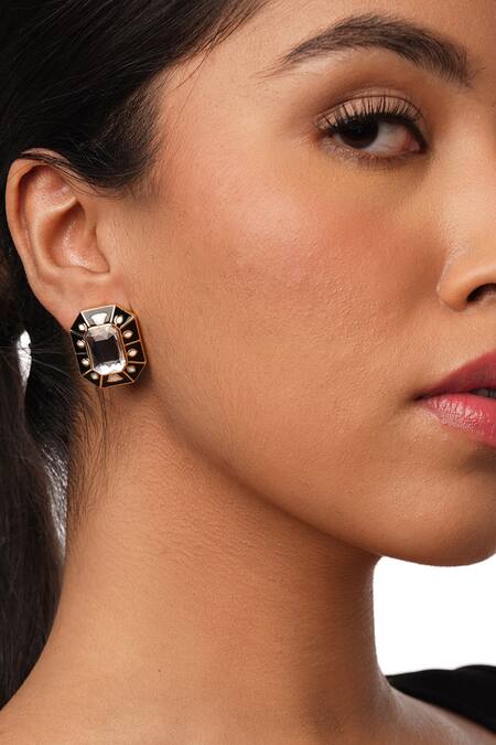Black stud earrings featuring a geometric cut work pattern with crystals and contrast white leaf and floral enamel details