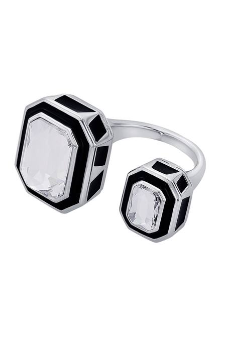 Rhodium plated ring, adorned with two light-catching crystals outlined with inky enamel.