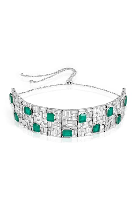Rhodium plated choker necklace featuring cubic zirconia and doublet emerald stone embellishments