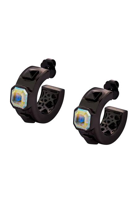Black plated metal hoop earrings featuring a geometric shape and embedded with Aurore Boreale Swarovski crystals
