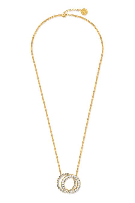 Gold long necklace featuring overlapping ring motifs adorned with Swarovski crystals and baguette hand-cut polki mirrors