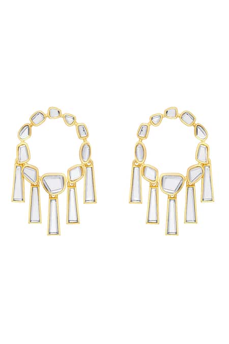 White dangler earrings featuring 18kt gold plated cutwork with mirror embellishments