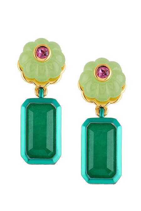 Green dangler earrings featuring a floral design and an emerald cut stone