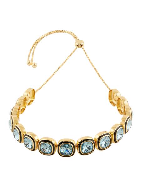 Blue choker featuring aqua crystal embellishments and enamelled work. Crafted in 0.3 micron, 18kt gold plated brass with a bolo closure.