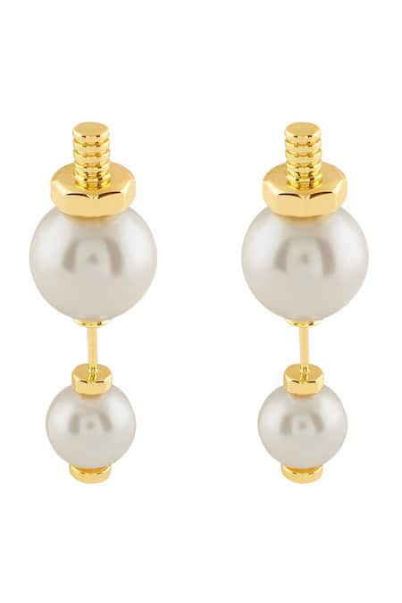 Gold colored brass stud earrings featuring illusion pearl and silicon details.
