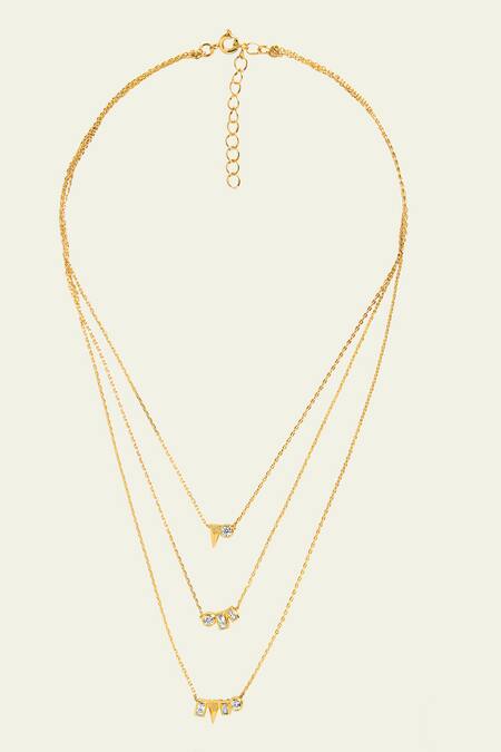 Gold layered abstract necklace featuring three strands embellished with cubic zirconia stones