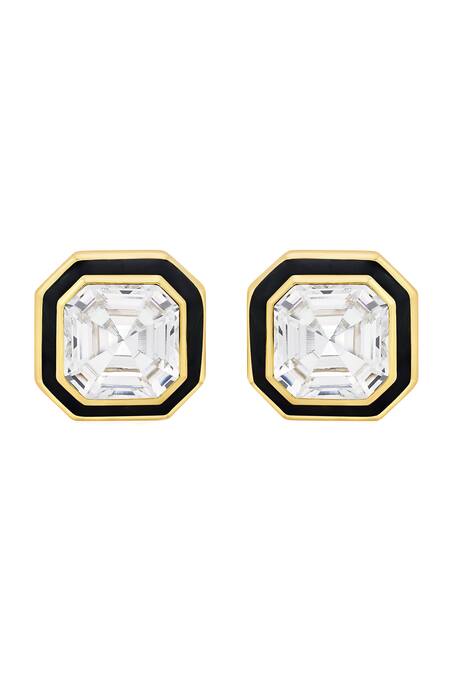 18-karat gold & black colored plated octagon shaped stud earrings with enameling & crystal embellishments.