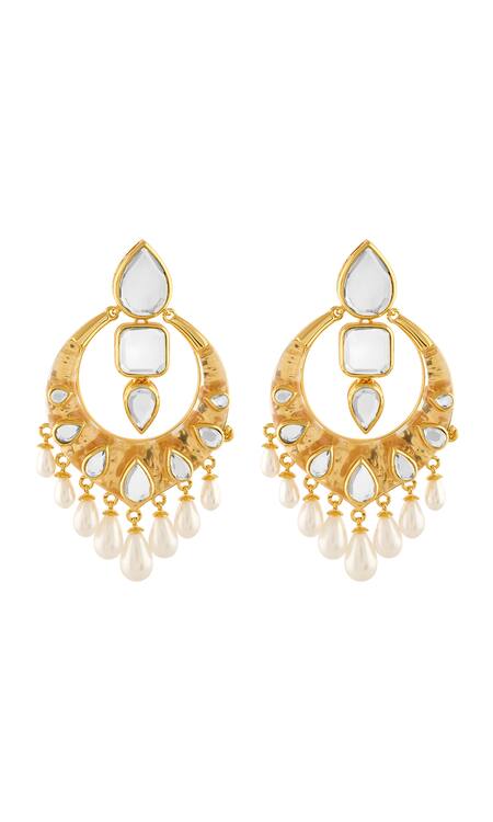 Gold chandbalis featuring mirror finish stones and pearl drops
