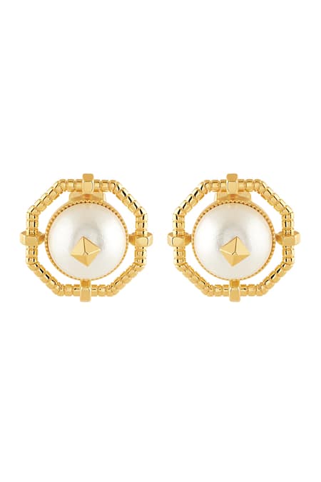 A pair of gold-toned brass stud earrings featuring a central pearl with a pyramid-shaped stud accent, set within an octagonal frame with textured detailing.