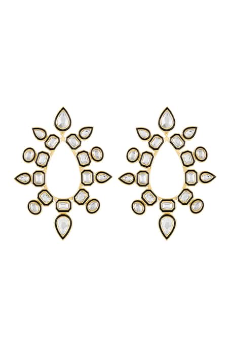 Gold tear drop shaped earrings featuring mocha mousse crystal embellishments and enamelled work