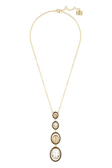 Y shaped pendant necklace featuring multicolor crystal embellishments and enamelled work. Made from brass with an 18kt gold plating and a lobster clasp closure.