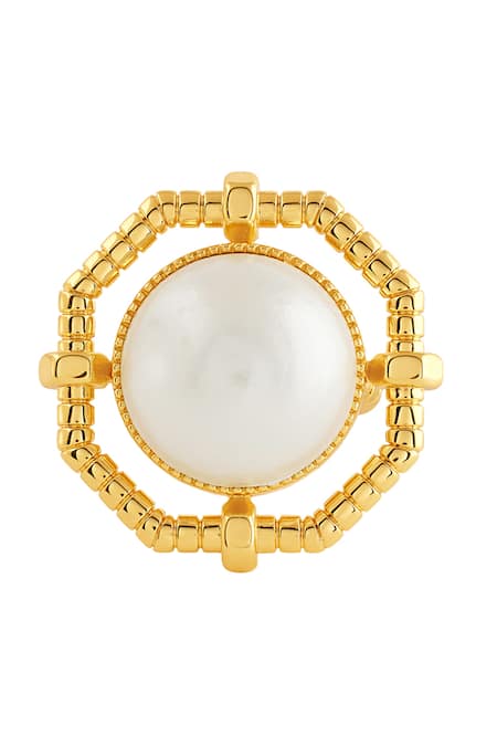 A gold brass statement ring featuring a large central pearl and intricate metal detailing.