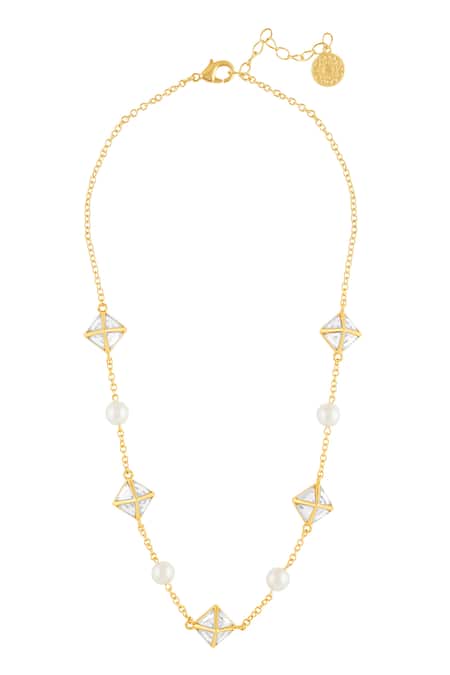 A gold-colored necklace crafted from brass, featuring pyramid-shaped mirror embellishments and round pearl accents.
