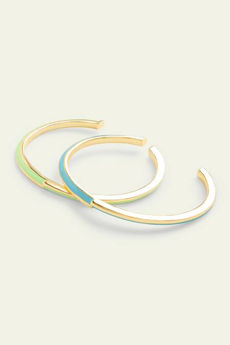 18kt gold plated set of 2 cuffs featuring green and blue enamelled work. Each cuff has a sleek and contemporary design with a round shape.