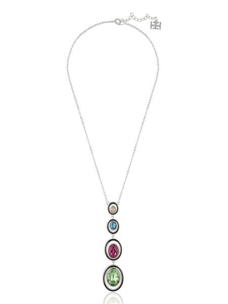 Y shaped pendant necklace featuring multicolor crystal embellishments and enamelled work. Crafted from brass with a lobster clasp closure.