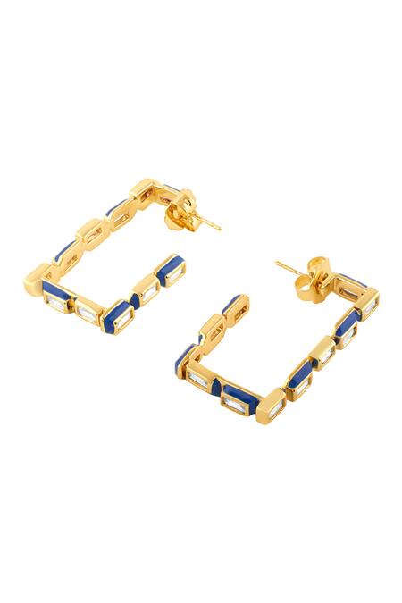 Square shaped hoops featuring blue enamel detailing and cubic zirconia stone embellishments