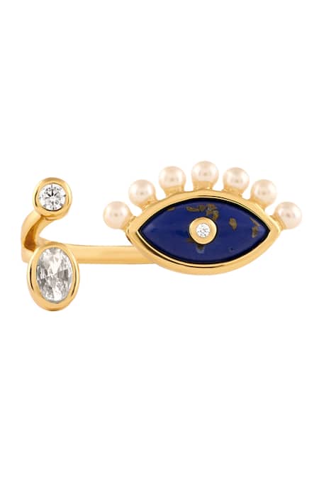 Gold plated ring featuring lapis lazuli, pearls, and crystal zirconia stones