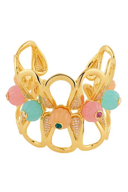 Multi-color whimsical bloom cuff bracelet featuring intricate designs and embellishments