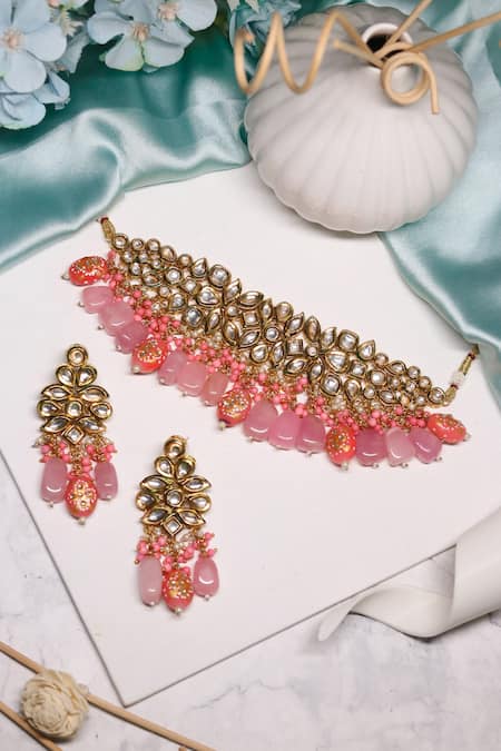Pink Beads, Stones Abstract Embellished Choker Necklace Set