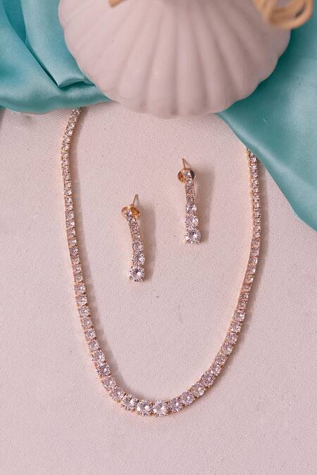 Rose gold toned with cubic zirconia embellishments, Push back clasp for earrings, Matching necklace and earrings set