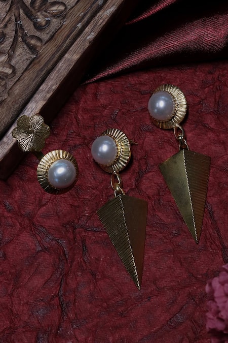 Gold dangler earrings featuring a pearl embellished round top and triangle pyramid drop. Accompanied by an open ring with asymmetric floral and round pattern motifs.