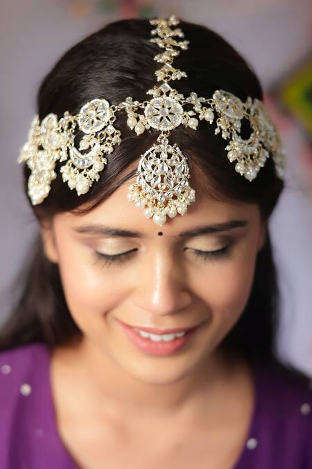 Gold floral shaped sheeshpatti featuring pearl and gemstone embellishments