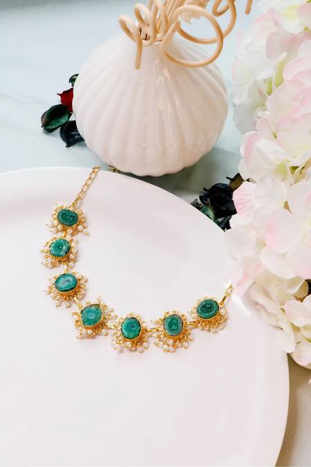 Gold toned necklace featuring abstract shaped green solar quartz stones with a beaded rim