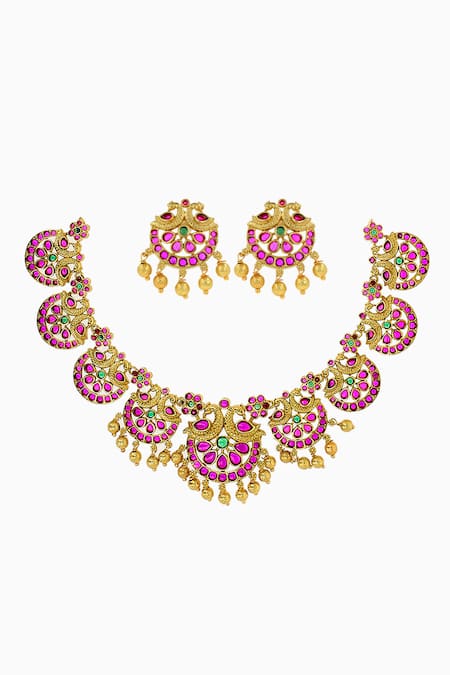 Carved peacock motifs on the necklace, Stone embellishments with bead drops, Stud earrings with push back clasp