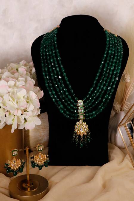 Green multiple layered necklace adorned with beads and a central pendant. Paired with matching earrings featuring intricate designs and bead embellishments.