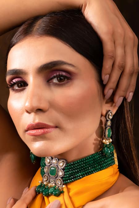 Gold toned choker featuring layered green onyx stone strings encrusted with kundans and American diamonds. Paired with matching dangler earrings adorned with leaf carvings.